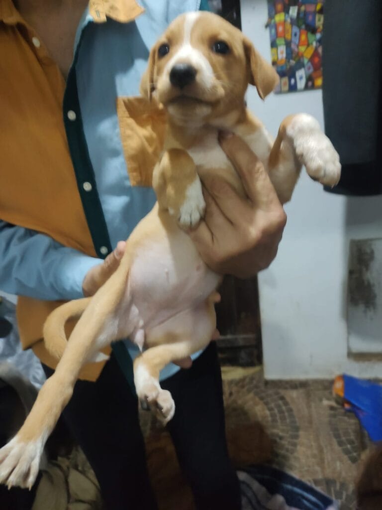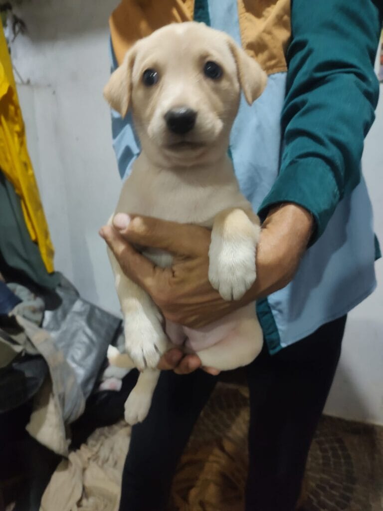 Maria tem pai Golden e mãe SRD. É muito ativada e feliz. Foi vermifugada e será doada com uma dose da V10.